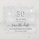 Une élégante carte Save the Date pour une fête de 30e anniversaire. Un arrière - plan moderne faux argenté décoré avec de la poussière de parties scintillant. Personnalisez et ajoutez une date et un nom/âge. Lettres de couleur grise. Le texte : Save the Date est écrit avec un grand script de style à la main tendance. Numéro 30 avec une police de style ballon.