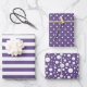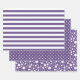 Trois motifs en violet et blanc poussiéreux : rayures de base, pois et taches aléatoires.