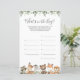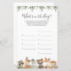 Baby shower à thème pour les animaux de bois devinez ce qui est dans la carte de jeu de sac comprend une aquarelle pour les animaux de bois illustration et aquarelle vert eucalyptus garland et élégante police manuscrite.