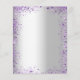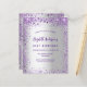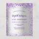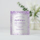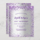 Une invitation à la fête d'anniversaire de 21e anniversaire, féminine et féminine (ou tout âge). Devant : Un arrière - plan à la mode faux argent. Décoré de parties scintillant violet foncé et violet, pétillant. Personnalisez et ajoutez un nom, des détails du parti. Le nom est écrit avec un script de style écrit à la main, des lettres de couleur violette. Dos : faux arrière - plan argent et faux parties scintillant. 1 feuille = 1 invitation