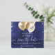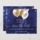 Une soirée branchée Save the Date pour un 18ème anniversaire (ou tout autre âge). Un arrière - plan bleu marine inégal. Décoré de parties scintillant bleu et faux or et de ballons d'or. Le texte : Save the Date est écrit avec un grand script de style à la main tendance.