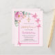 Un arrière - plan rose vif avec une arche. Décorée d'une fleur rose rose, d'une végétation d'eucalyptus vert aquarelle et de papillons. Personnalisez et ajoutez un nom et des détails. Dos : couleur arrière - plan rose pâle. 1 feuille = 1 invite imprimé bord à bord.