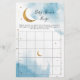 Au-dessus de la carte d'activité du baby shower à thème de lune. Amusez-vous à votre baby shower avec cette carte de jeu de bingo. Aquarelle en bleu avec fausse lune d'or et étoiles. Le jeu de bingo demande aux invités de deviner quels cadeaux la future maman recevra. Illustration et dessin originaux de Namibear Art Studio.©Namibear