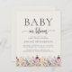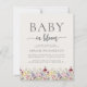 Une belle bordure florale d'aquarelle fleur sauvage décore le bord inférieur de cette invitation à baby shower boho tendance. Les mots "Baby in florom" apparaissent dans les polices serif et script, avec des swashes avant et après le script. Personnalisez le texte avec le nom de la future maman et les détails de la douche en gris fusain sur un arrière - plan beige. L'envers offre de l'espace pour la tombola de couche, les livres pour bébé, et les détails du registre (ou n'importe laquelle des trois catégories de votre choix), ainsi qu'un code QR pratique que les clients peuvent scanner pour visiter le registre. Idéal pour le baby shower d'une fille.