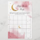 Au-dessus de la carte d'activité du baby shower à thème de lune. Amusez-vous à votre baby shower avec cette carte de jeu de bingo. Aquarelle en rose avec fausse lune d'or et étoiles. Le jeu de bingo demande aux invités de deviner quels cadeaux la future maman recevra. Illustration et dessin originaux de Namibear Art Studio.©Namibear