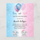 Pour un baby shower pour un bébé garçon et bébé fille. Arrière - plan bleu blanc et rose. Décoré de parties scintillant et bleu, ballons roses et blancs et poussière de parties scintillant. Un petit éléphant et un éléphant de gaby girl. Personnalisez et ajoutez le nom de la future maman et les détails de la fête. Le nom et le texte : Garçon ou Fille sont écrits avec un script de style manuscrit 1 feuille = 1 invitation imprimé bord à bord.