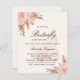 Pour un baby shower de style boho moderne. Arrière - plan beige. Décoré de fleurs roses, de roses, d'herbe de pampas et d'un papillon. Personnalisez et ajoutez un nom et des détails du parti. 1 feuille = 1 invite imprimé bord à bord.