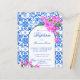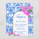 Carrelage bleu et Bougainvilliers élégant méditerranéen grec Santorini Mykonos thème bébé baptême baptême budget modèle invitation.