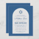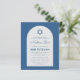 Une invitation à mitzvah bar budget. Sur un arrière - plan bleu classique, il a une arche blanche avec du texte bleu à l'intérieur. Le nom est écrit dans un élégant script calligraphique. Au-dessus du texte il y a une étoile bleue de David.