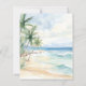 An elegant wedding invitation for a beach wedding, destination wedding. A watercolored sandy beach, ocean waves and palm trees as background.