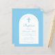 Une invitation au baptême moderne. Sur un arrière - plan bleu bébé, il a une arche blanche avec du texte bleu à l'intérieur. Le mot Baptême et le nom sont écrits dans un élégant script calligraphique; la première ligne est le texte arché.