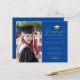 Cette élégante carte de faire-part de graduation photo budget personnalisée présente votre photo à gauche et à droite un faux casquette de grade d'or avec le mot "Graduate", classe/année, nom et autres détails de cérémonie dans la fausse calligraphie de script d'or formelle pour personnaliser sur un arrière - plan bleu royal. Conçu par Susan Coffey.