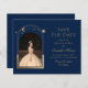 Bleu céleste Enregistrer la date Anniversaire Quinceanera Invitation présente un cadre de soleil doré, de lune et d'étoiles sur un arrière - plan bleu. À l'intérieur est votre photo préférée et votre Quinceanera personnalisée enregistrer les informations de date. Personnalisez en modifiant le texte dans les zones de texte et en ajoutant votre photo préférée. Conçu pour vous par ©2024 Evco Studio www.zazzle.com/store/evcostudio