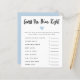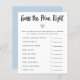 Carte de jeu de baby shower moderne et simple avec un coeur bleu. Les textes sont modifiables. Un jeu parfait à jouer sous la douche. Il énumère l'essentiel pour bébé et demande aux clients de deviner le prix. Celui qui devine le prix le plus proche gagne !