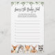 Baby shower à thème pour animaux de bois devinez la carte de jeu pour aliments pour bébés avec une aquarelle safari animaux illustration et aquarelle vert eucalyptus garland et élégante police manuscrite.