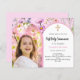 Ajoutez votre propre photo de taille verticale. Un cadre photo en arc rose. Couleur arrière - plan blanche. Décoré de fleurs roses et d'une croix dorée. Personnalisez et ajoutez un nom et des détails. 1 feuille = 1 invite imprimé bord à bord.