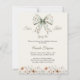An elegant soft ivory background, decorated with a floral bow in muted green and muted pink. Personalize and add a name and party details. Text: She's tying the Knot.