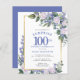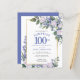 Honorer une femme spéciale avec cette invitation élégante et féminine Budget 100e anniversaire Surprise Party. Surprise et 100e sont écrites en gros texte bleu. Célébration d'anniversaire suit. Le nom de l'invité honoré est également en lettres majuscules bleues. Les détails de la fête d'anniversaire sont entourés d'un cadre doré chic. Les fleurs bleues et les roses blanches sont nichées dans des feuilles verts.