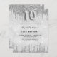 Une invitation moderne, élégante et glamour pour la fête du 10e anniversaire d'une fille. Un arrière - plan faux argenté, décoré de poussière de parties scintillant. Personnalisez et ajoutez votre nom et les détails de votre fête. Le numéro 10 est écrit avec une police de style ballon, un script.