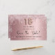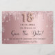 Une petite fille et tendance Enregistrer la carte Date pour une fête de 18e anniversaire. Arrière - plan de dégradé rose vif décoré avec des gouttes et de la poussière de parties scintillant rose rose et faux argent poussiéreux. Personnalisez et ajoutez une date et un nom/texte. Le texte : Save the Date est écrit avec un grand script de style à la main tendance. Numéro 18 avec une police de style ballon.