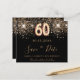 Une fille et tendance Enregistrer la date pour une fête de 60e anniversaire. Un arrière - plan noir décoré de parties scintillant en faux or. Modèles pour une date, un nom et un texte. Lettres de couleur dorée. Le texte : Save the Date est écrit avec un grand script de style à la main tendance.