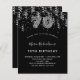 Une invitation moderne, élégante et glamour pour une fête de 70e anniversaire. Un arrière - plan noir, décoré de confettis argentés. Le nom est écrit avec un script de style moderne écrit à la main. Personnalisez et ajoutez les détails de votre fête. Le numéro 70 est écrit avec une police de style ballon tendance, motif léopard.
