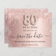 Une petite fille et tendance Enregistrer la carte Date pour une fête de 80e anniversaire. arrière - plan rose à dégradé d'or décoré avec de l'or rose et des gouttes de parties scintillant faux argent. Personnalisez et ajoutez une date et un nom/texte. Le texte : Save the Date est écrit avec un grand script de style à la main tendance avec des swashes. Numéro 80 avec une police de style ballon.