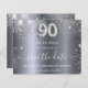 Une élégante carte Save the Date pour une fête de 90e anniversaire. Un arrière - plan métallique faux argent moderne, décoré avec de la poussière de parties scintillant. Personnalisez et ajoutez une date et un nom/âge. Le texte : Save the Date est écrit avec un grand script de style à la main tendance. Numéro 90 avec une police de style ballon.