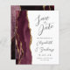 Le bord gauche de cet élégant mariage moderne, à l'exception de la carte de date, est doté d'une bordure d'aquarelle rouge bordeaux et ornée d'une parties scintillant en faux or. Le texte personnalisable combine écriture manuscrite grise au fusain, cuivre et polices italiques sur un arrière - plan blanc. L'envers est assorti d'un design d'agate bordeaux et or.