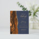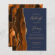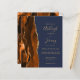 Le bord gauche de cette élégante faire-part de mariage moderne est orné d'une bordure d'aquarelle orange brûlée, recouverte d'une parties scintillant en faux or. Le texte personnalisable combine écriture manuscrite couleur or, copperplate et polices italiques sur un arrière - plan bleu marine foncé. L'envers est assorti d'une agate orange brûlée et dorée.