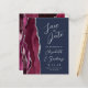 Le bord gauche de cet élégant mariage moderne, à l'exception de la carte de date, est doté d'une bordure d'aquarelle rouge bordeaux et ornée d'une parties scintillant en faux argent. Le texte personnalisable combine écriture gris argenté, copperplate et polices italiques sur un arrière - plan bleu marine. L'envers est assorti d'un design d'agate bordeaux et argenté.