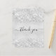 Un carte de remerciements d'anniversaire féminin et élégant. Une couleur arrière - plan à l'aspect métallique faux argenté. Avec de la poussière de parties scintillant fausse. Sur l'avant grand main écriture et le texte : Merci. Retour : Personnalisez et ajoutez Votre note de remerciement et votre nom. Le nom est écrit avec un script de style moderne écrit à la main avec des swashes. Pour que les swashes ne suppriment que le nom de l'échantillon, laissez les espaces ou émoticônes devant et après le nom.