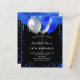 Une invitation à la fête d'anniversaire de 18e anniversaire, féminine et féminine (ou tout âge). Devant : Un arrière - plan noir chic. Décoré avec des gouttes de parties scintillant bleu royal, la peinture goutte à goutte et les ballons. Personnalisez et ajoutez un nom et des détails du parti. Le nom est écrit avec un script de style écrit à la main.