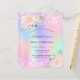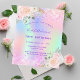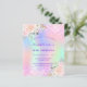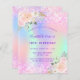 Une invitation à la fête d'anniversaire de 18e anniversaire, féminine et féminine (ou tout âge). Devant : Un arc-en-ciel, arrière - plan de couleur holographique en violet, rose, vert menthe, or rose. Décoré de faux parties scintillant rose vif, brille. Personnalisez et ajoutez un nom et des détails du parti. Le nom est écrit avec un script de style écrit à la main, des lettres de couleur violette.