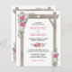 Invitations de mariage budget avec un simple arrière - plan blanc qui peut être changé à n'importe quelle couleur, un élégant tableau à fleurs rose & blanc à l'aquarelle sur une arche mariage rustique en bois, un coeur sculpté avec les initiales des couples, et un élégant modèle de mariage éditable.