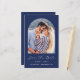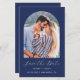 Cette simple et minimaliste carte Save the Date comporte une photo verticale en forme d'arc au-dessus des mots "Save the Date" en élégant script d'écriture manuscrite blanche, suivie des noms du couple, date mariage et ville en sans serif police sur un arrière - plan bleu marine. Ajoutez un message plus détaillé au verso, accompagné d'un code QR pour aider vos invités à visiter votre site mariage.