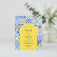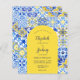 Ce design rustique présente un motif arrière - plan de carreaux portugais bleu, jaune et blanc d'aquarelle, ou azulejos. Personnalisez-le avec les noms de la mariée et du marié dans le script de calligraphie bleue et le texte restant dans une combinaison de sans serif, cuivre et italique sur une forme d'arc jaune. Un motif de mosaïque correspondant apparaît à l'envers.