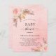 Pour un baby shower de style boho moderne. Un arrière - plan rose pâle, couleur aquarelle, dégradé, avec des étincelles d'or. Décoré de fleurs roses d'or et de rose, de roses et d'herbe de pampas. Personnalisez et ajoutez un nom et des détails du parti.