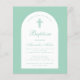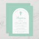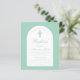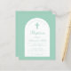 Une invitation au baptême moderne. Sur un arrière - plan vert menthe, il a une arche blanche avec du texte menthe à l'intérieur. Le mot Baptême et le nom sont écrits dans un élégant script calligraphique; la première ligne est le texte arché.