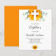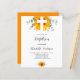 Un arrière - plan blanc décoré d'une croix blanche, de tournesol aquarellé, de verdure d'eucalyptus et de feuilles dorés. Personnalisez et le nom des enfants et les détails de la cérémonie. Non sexiste. Retour : arrière - plan orange. Vous pouvez modifier la couleur de l'arrière - plan si vous le souhaitez.