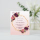 Sur le devant : Une invitation pour une fête d'anniversaire de 40e (ou tout âge). Un or rose élégant et tendance, arrière - plan à dégradé blanc avec un cadre géométrique en faux or. Décoré de fleurs violettes foncées et bordeaux, de plumes roses et boho. Modèles pour un nom et les détails de la fête. Le nom est écrit avec un script de style écrit à la main, des lettres de couleur violette. Dos : or rose, arrière - plan blanc dégradé.