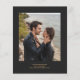 Cet élégant design de mariage comprend une photo verticale du couple adouci avec un écran blanc pour mettre en évidence la superposition du texte. Le bord gauche est doté d'une bordure en aquarelle noire découpée avec une parties scintillant en faux or. Le texte noir personnalisable combine écriture manuscrite, copperplate et polices italiques. Remplacez facilement l'exemple d'image au dos par une deuxième photo verticale, et ajoutez un bref message avec des informations supplémentaires telles que l'URL de votre site Web mariage.