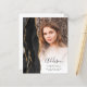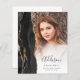 Ce faire-part de graduation 2025 branché est doté d'une bordure de géode d'aquarelle noire avec des reflets de parties scintillant en or. Le prénom du diplômé apparaît comme une élégante écriture manuscrite gris fusain superposée sur une photo verticale, avec le nom de famille, l'école et l'année de classe en caractères cuivre. Un filtre en dégradé blanc permet de faire apparaître le texte. Une deuxième photo horizontale apparaît au dos, ainsi que la faire-part et les détails dans le texte gris charbon sur un arrière - plan blanc.