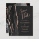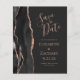 Le bord gauche de cet élégant mariage moderne, à l'exception de la carte de date, est doté d'une bordure en aquarelle noire recouverte d'une parties scintillant en or rose. Le texte personnalisable associe écriture rose, copperplate et polices italiques sur un arrière - plan gris fusain foncé. L'envers présente un design d'agate d'or noir et rose assorti.
