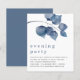 Invitation de soirée Blue Artsy Foliage. Une alternative économique pour PETIT 4,5 po x 5,6 po. Disponible dans un STOCK SEMI GLOSS 110 lb CARD ou un STOCK SATIN FINISH 80 lb THINNER PAPER. Les enveloppes sont en option. Style informel. Les feuilles d'aquarelle profonde moderne décorent le dessus et le titre est grand en bas en minuscules élégantes avec les détails en bas. Personnalisez facilement le texte à vos propres détails.