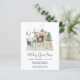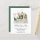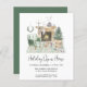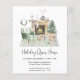 Invitation à la maison ouverte de vacances d'inspiration boho budget avec une aquarelle illustrant un intérieur confortable de maison verte sage et cheminée décorée pour Noël avec une couronne, rennes, un arbre de Noël, des bougies et des gnomes.