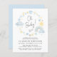 Jolie et fantasque invitation à la douche bébé garçon pas cher avec des couleurs pastel bleu et jaune d'inspiration boho d'un arc-en-ciel, soleil, coeurs, étoiles, lunes et nuages et "Oh Baby !" dans un script de calligraphie élégant.
