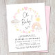 Jolie invitation à saupoudrer pour bébé charmante et économique qui présente des aquarelles rose pastel et jaune d'inspiration boho d'un arc-en-ciel, soleil, coeurs, étoiles, lunes et nuages et "Oh Baby !" dans un script de calligraphie élégant.