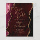 Ce mariage élégant sauvegarder la carte date dispose d'une image arrière - plan d'agate d'aquarelle rouge bordeaux, taillée avec une parties scintillant en faux or. Le texte personnalisable combine écriture manuscrite moderne couleur or, cuivre et polices italiques. L'envers présente un design coordonné d'agate bordeaux et or.