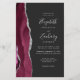 The left-hand edge of this elegant modern wedding invitation features a burgundy watercolor agate border trimmed with silver faux glitter. The customizable text combines silver gray handwriting, copperplate and italic fonts on an off-black background. The back features a matching burgundy and silver agate design.
